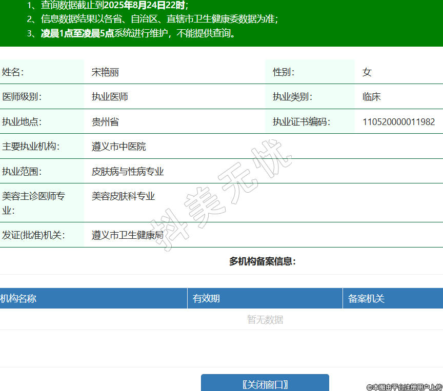 姓名:宋艳丽性别:女医师级别:执业医师执业类别:临床执业地点:贵州省执业证书编码:110520000011982主要执业机构:遵义市中医院执业范围:皮肤病与性病专业美容主诊医师专业:美容皮肤科专业发证(批准)机关:遵义市卫生健康局 -