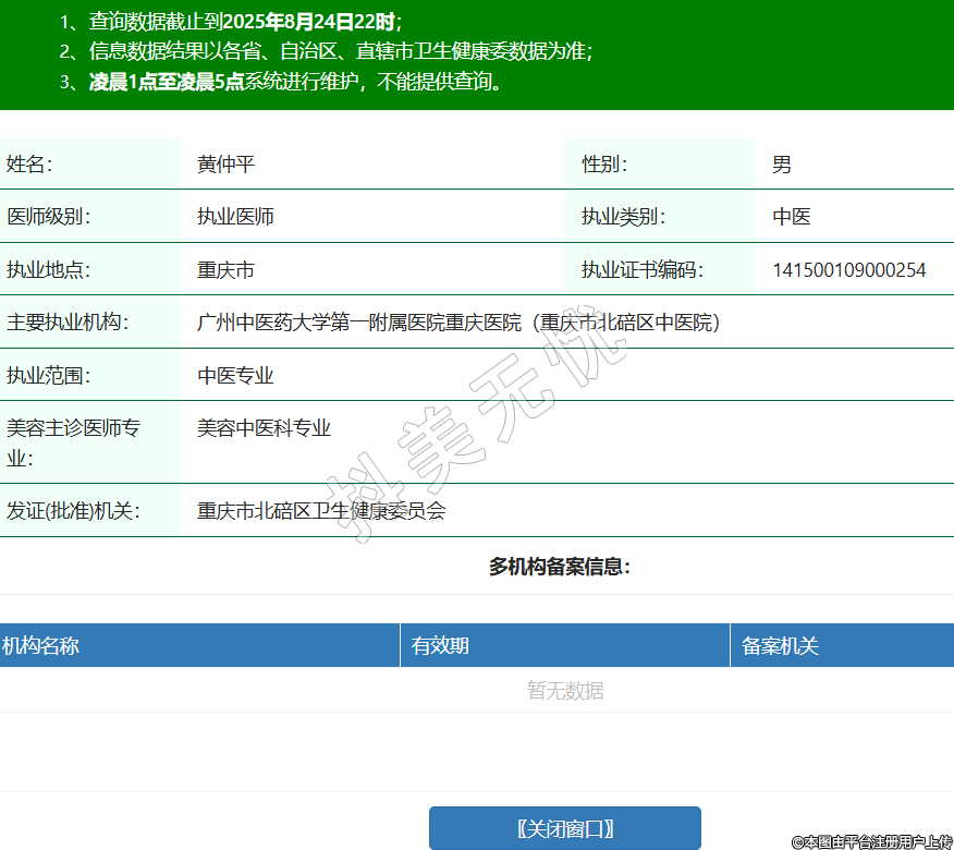 姓名:黄仲平性别:男医师级别:执业医师执业类别:中医执业地点:重庆市执业证书编码:141500109000254主要执业机构:广州中医药大学第一附属医院重庆医院(重庆市北碚区中医院)执业范围:中医专业美容主诊医师专业:美容中医科专业发证(批准)机关:重庆市北碚区卫生健康委员会 -