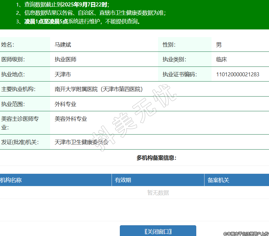 姓名:马建斌性别:男医师级别:执业医师执业类别:临床执业地点:天津市执业证书编码:110120000021283主要执业机构:南开大学附属医院(天津市第四医院)执业范围:外科专业美容主诊医师专业:美容外科专业发证(批准)机关:天津市卫生健康委员会 -