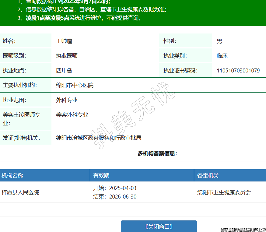 姓名:王帅道性别:男医师级别:执业医师执业类别:临床执业地点:四川省执业证书编码:110510703001079主要执业机构:绵阳市中心医院执业范围:外科专业美容主诊医师专业:美容外科专业发证(批准)机关:绵阳市涪城区政务服务和行政审批局多机构备案信息:机构名称 有效期 备案机关 梓潼县人民医院 开始:2025-04-03结束:2026-06-30绵阳市卫生健康委员会 -