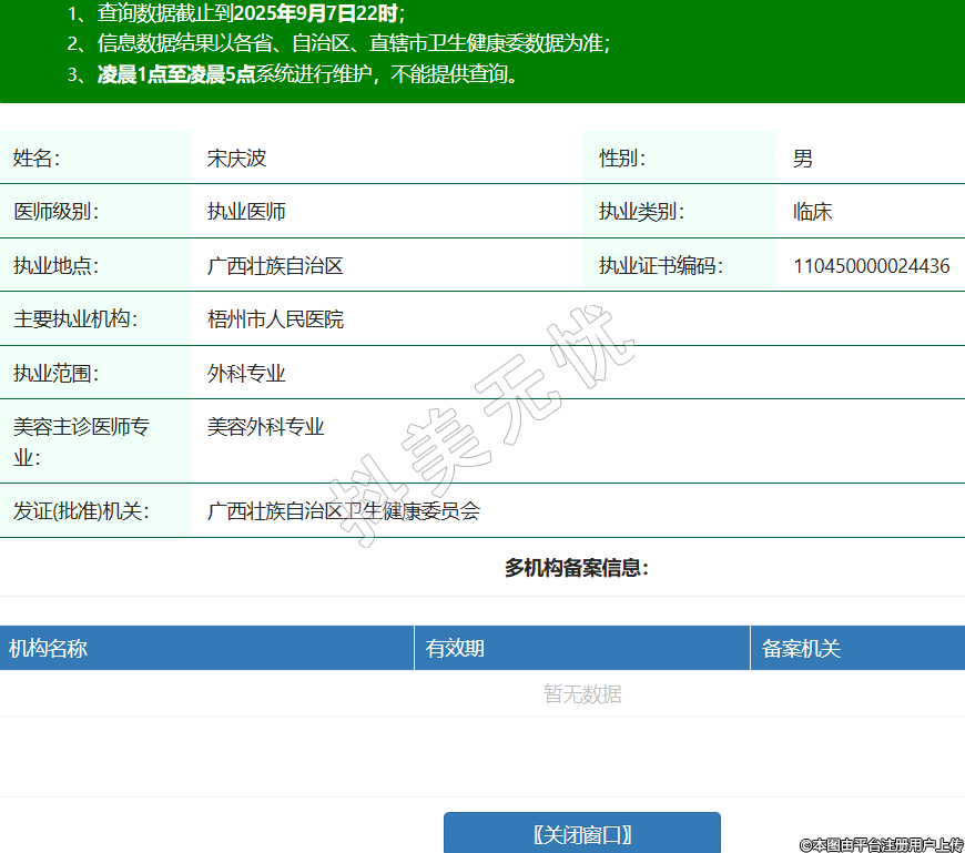 姓名:宋庆波性别:男医师级别:执业医师执业类别:临床执业地点:广西壮族自治区执业证书编码:110450000024436主要执业机构:梧州市人民医院执业范围:外科专业美容主诊医师专业:美容外科专业发证(批准)机关:广西壮族自治区卫生健康委员会 -