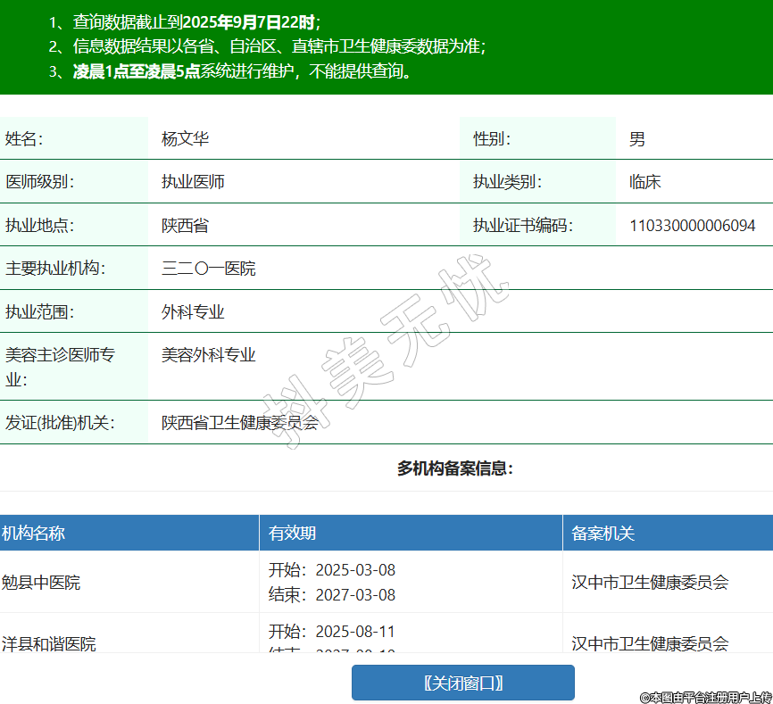 姓名:杨文华性别:男医师级别:执业医师执业类别:临床执业地点:陕西省执业证书编码:110330000006094主要执业机构:三二〇一医院执业范围:外科专业美容主诊医师专业:美容外科专业发证(批准)机关:陕西省卫生健康委员会多机构备案信息:机构名称 有效期 备案机关 勉县中医院 开始:2025-03-08结束:2027-03-08汉中市卫生健康委员会 洋县和谐医院 开始:2025-08-11结束:2027-08-10汉中市卫生健康委员会 勉县妇幼保健院 开始:2025-08-23结束:2027-08-22汉中市卫生健康委员会 -