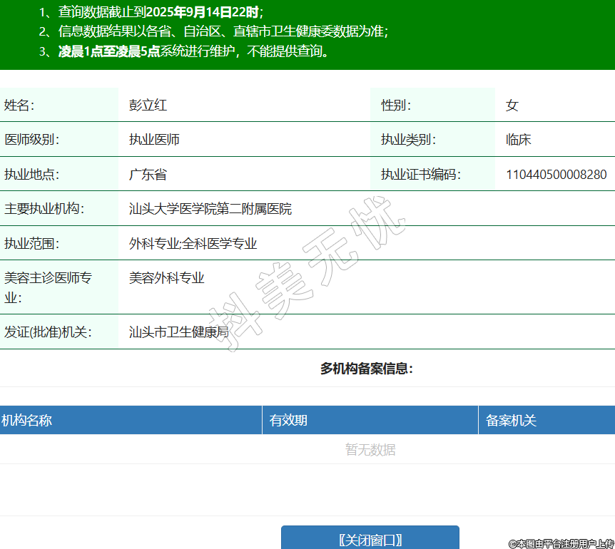 姓名:彭立红性别:女医师级别:执业医师执业类别:临床执业地点:广东省执业证书编码:110440500008280主要执业机构:汕头大学医学院第二附属医院执业范围:外科专业;全科医学专业美容主诊医师专业:美容外科专业发证(批准)机关:汕头市卫生健康局 -