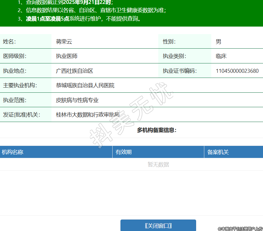 姓名:蒋荣云性别:男医师级别:执业医师执业类别:临床执业地点:广西壮族自治区执业证书编码:110450000023680主要执业机构:恭城瑶族自治县人民医院执业范围:皮肤病与性病专业发证(批准)机关:桂林市大数据和行政审批局 -