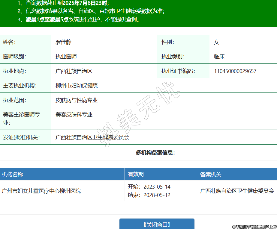 姓名:罗佳静性别:女医师级别:执业医师执业类别:临床执业地点:广西壮族自治区执业证书编码:110450000029657主要执业机构:柳州市妇幼保健院执业范围:皮肤病与性病专业美容主诊医师专业:美容皮肤科专业发证(批准)机关:广西壮族自治区卫生健康委员会多机构备案信息:机构名称 有效期 备案机关 广州市妇女儿童医疗中心柳州医院 开始:2023-05-14结束:2028-05-12广西壮族自治区卫生健康委员会 -