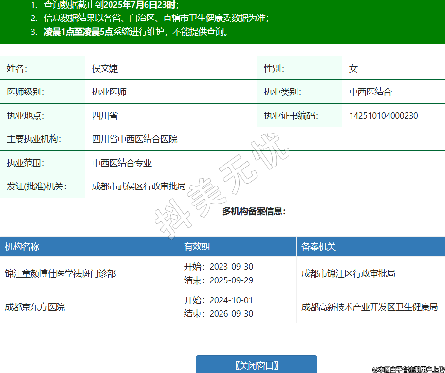 姓名:侯文婕性别:女医师级别:执业医师执业类别:中西医结合执业地点:四川省执业证书编码:142510104000230主要执业机构:四川省中西医结合医院执业范围:中西医结合专业发证(批准)机关:成都市武侯区行政审批局多机构备案信息:机构名称 有效期 备案机关 锦江童颜博仕医学祛斑门诊部 开始:2023-09-30结束:2025-09-29成都市锦江区行政审批局 成都京东方医院 开始:2024-10-01结束:2026-09-30成都高新技术产业开发区卫生健康局 -
