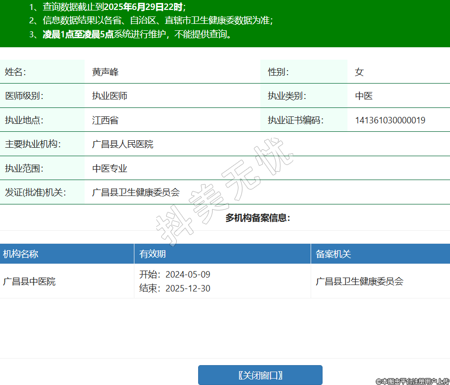 姓名:黄声峰性别:女医师级别:执业医师执业类别:中医执业地点:江西省执业证书编码:141361030000019主要执业机构:广昌县人民医院执业范围:中医专业发证(批准)机关:广昌县卫生健康委员会多机构备案信息:机构名称 有效期 备案机关 广昌县中医院 开始:2024-05-09结束:2025-12-30广昌县卫生健康委员会 -