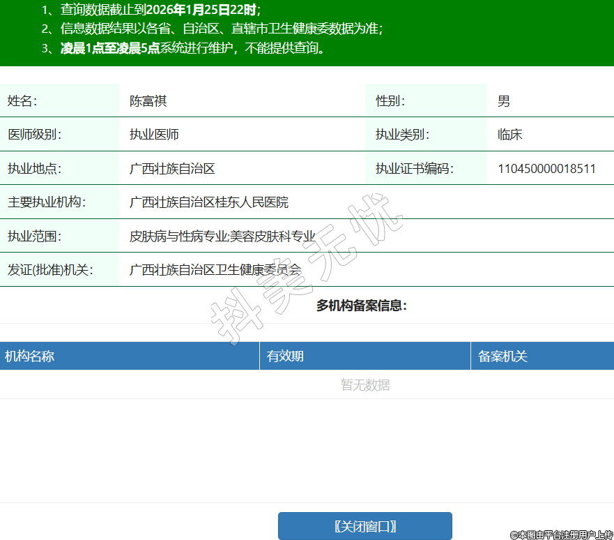 姓名:陈富祺性别:男医师级别:执业医师执业类别:临床执业地点:广西壮族自治区执业证书编码:110450000018511主要执业机构:广西壮族自治区桂东人民医院执业范围:皮肤病与性病专业;美容皮肤科专业发证(批准)机关:广西壮族自治区卫生健康委员会 -