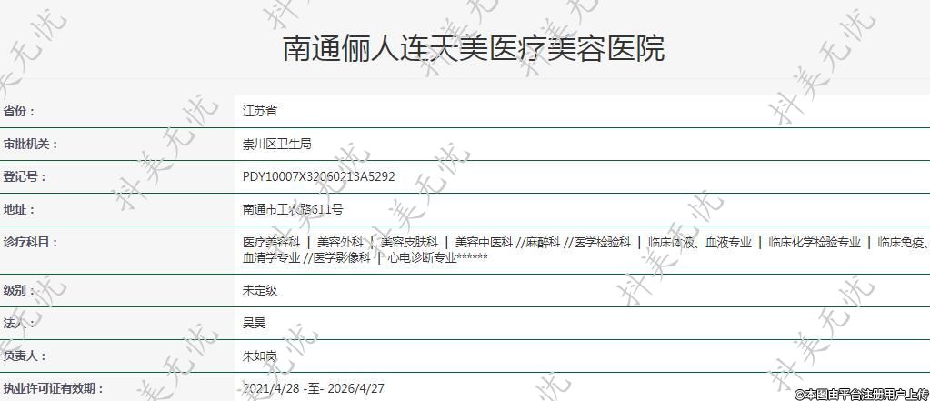 南通俪人连天美医疗美容的诊疗科目有医疗美容科、美容外科、美容皮肤科、美容中医科、麻醉科、医学检验科、临床体液、血液专业、临床化学检验专业、临床免疫、血清学专业、医学影像科、心电诊断专业******