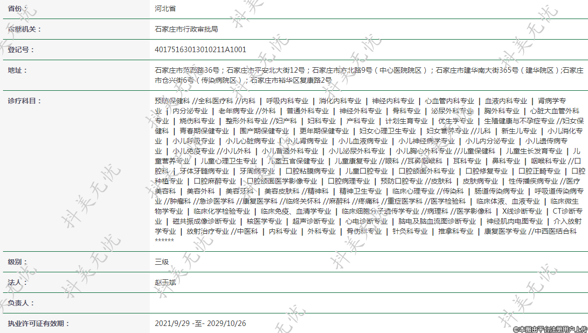 地址:石家庄市范西路36号;石家庄市平安北大街12号;石家庄市方北路9号(中心医院院区);石家庄市建华南大街365号(建华院区);石家庄市仓兴街6号(传染病院区);石家庄市裕华区复康路2号