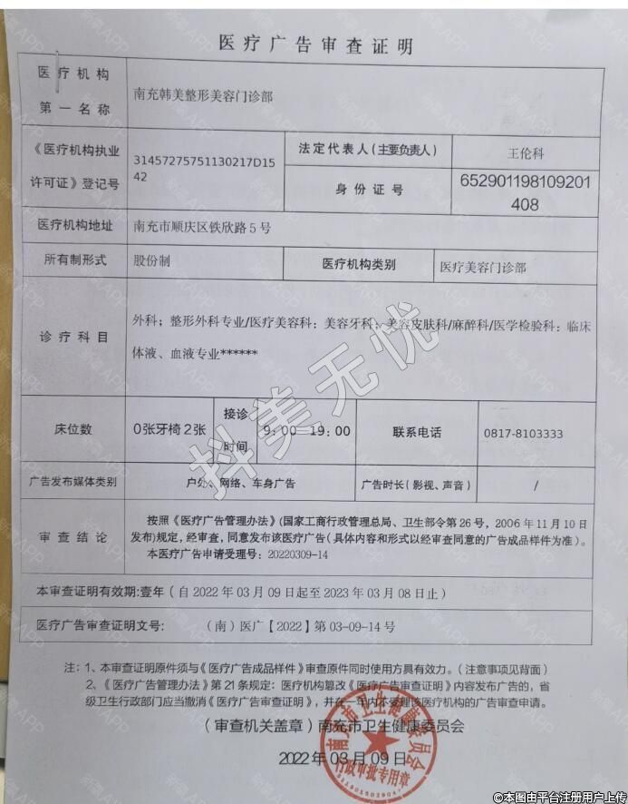 诊疗科目:外科整形外科专业//医疗美容科|美容外科|美容牙科|美容皮肤科//麻醉科//医学检验科|临床体液、血液专业*****