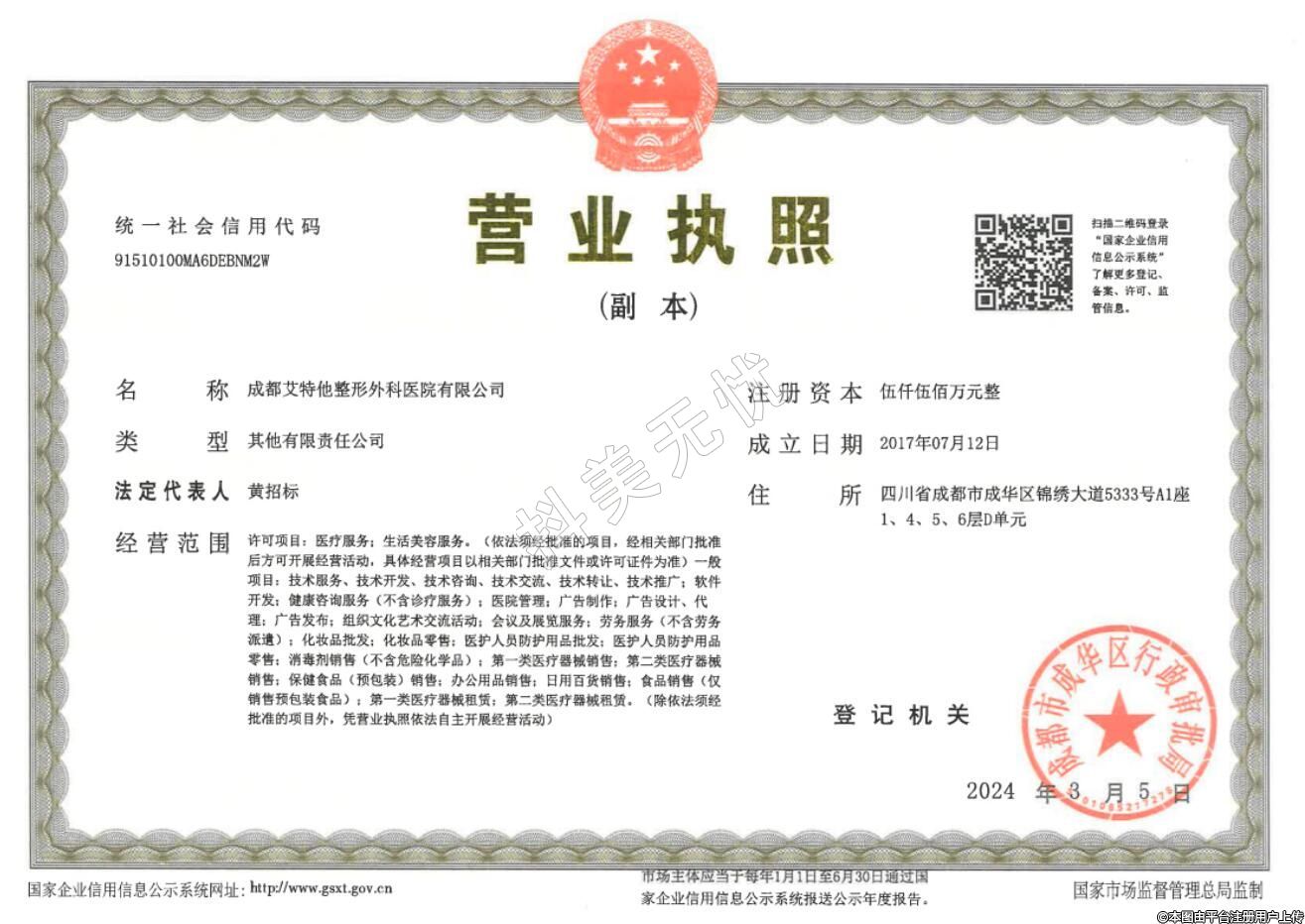诊疗科目:外科:整形外科专业,/医疗美容科:美容外科;美容牙科;美皮肤科:美容中医科/麻醉科:/庆学检验科:临床体液、血与业:临床微生物学专业:临床化学检验专业:临床免疫、血清学专业、/病理科(协议) /医学影像科:X线诊断专业,超声诊断专业:电诊断专业******其他许可信息详见副本