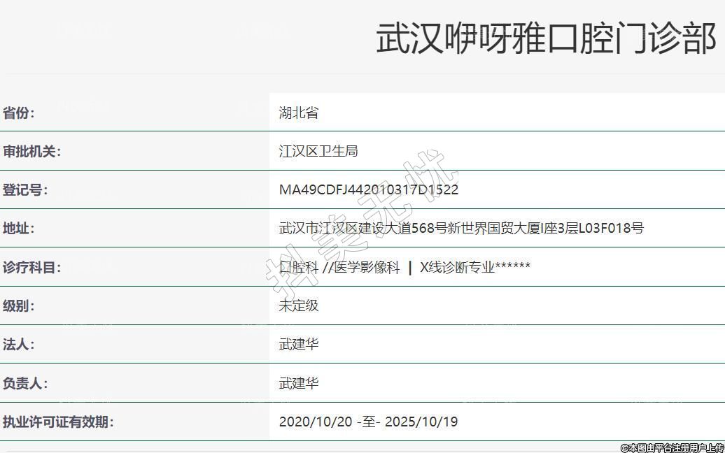 武汉咿呀雅口腔成立于2019-11-08,地址:武汉市江汉区建设大道568号新世界国贸大厦I座3层L03F018号,诊疗科目:口腔科 //医学影像科 | X线诊断专业******