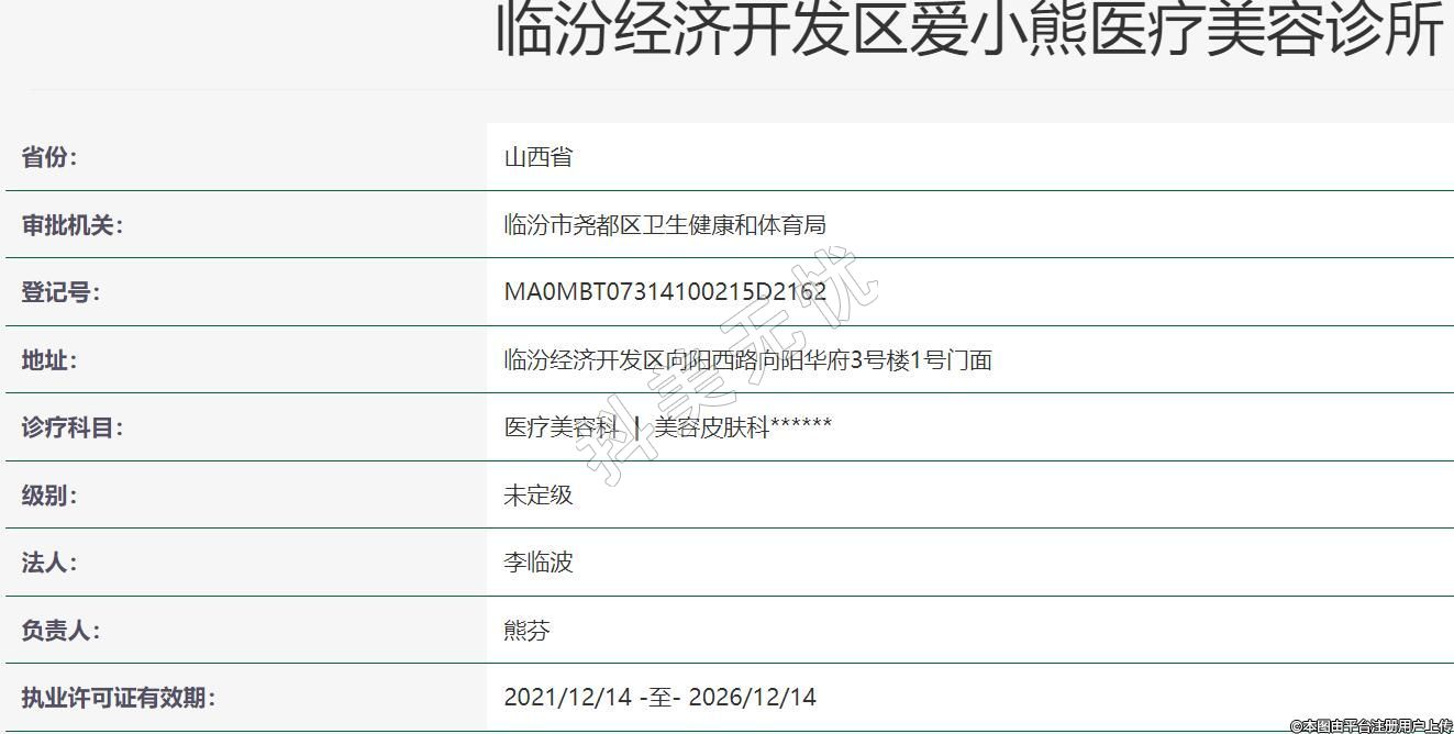 临汾爱小熊医疗美容成立于2021-08-03,地址:临汾经济开发区向阳西路向阳华府3号楼1号门面,诊疗科目:医疗美容科 | 美容皮肤科******
