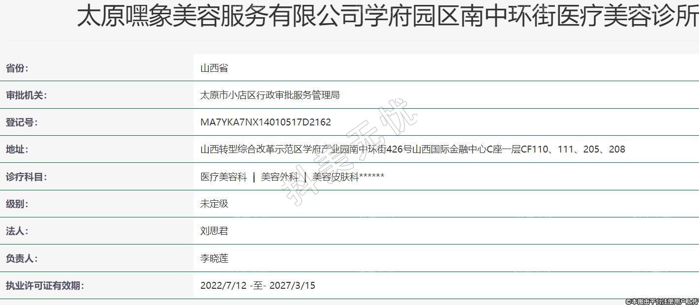 太原嘿象医疗美容成立于2021-10-22,地址:山西转型综合改革示范区学府产业园南中环街426号山西国际金融中心C座一层CF110、111、205、208,诊疗科目:医疗美容科 | 美容外科 | 美容皮肤科******