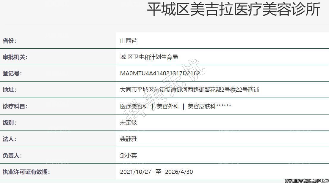 大同美吉拉医疗美容成立于2021-06-01,地址:大同市平城区东街街道御河西路御馨花都2号楼22号商铺,诊疗科目:医疗美容科 | 美容外科 | 美容皮肤科******