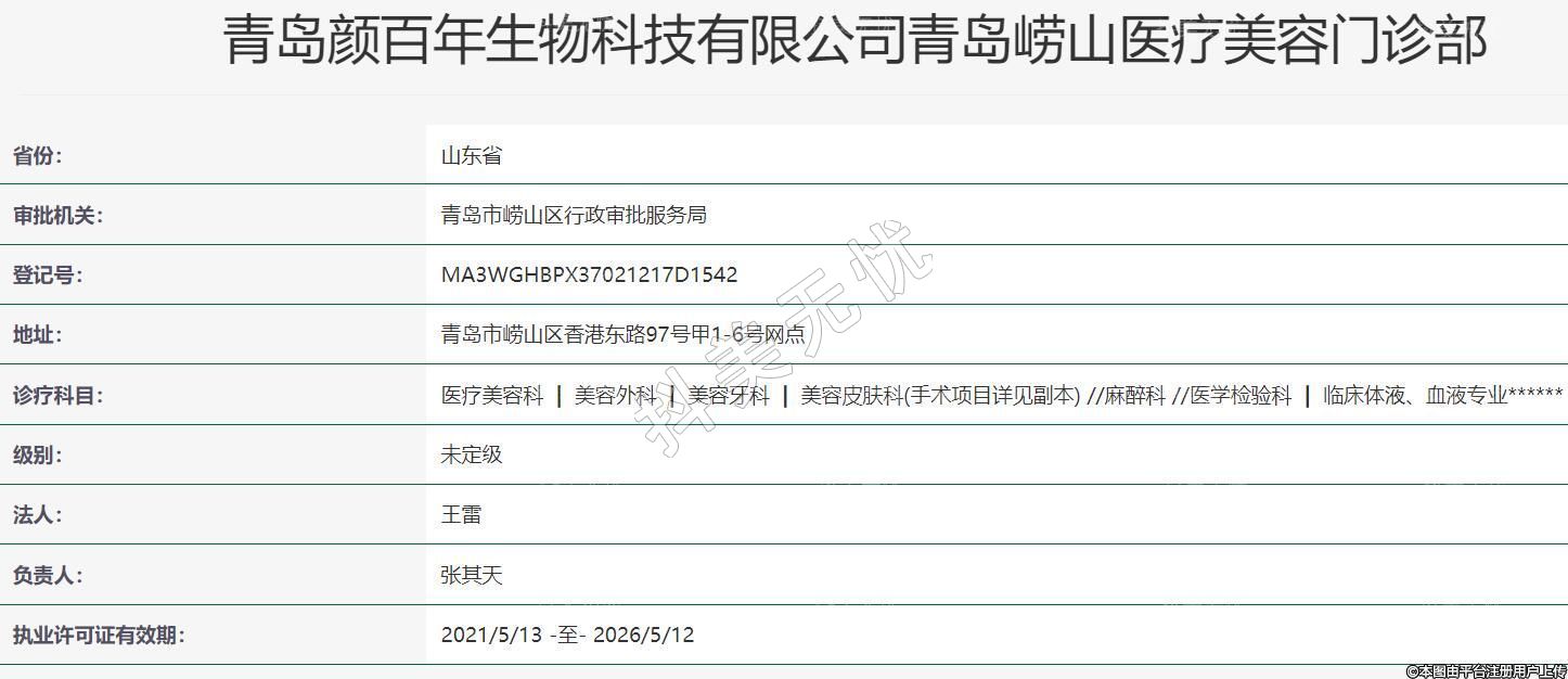 青岛颜百年生物科技有限公司青岛崂山医疗美容门诊部,成立于2021年3月26日,位于山东省青岛市崂山区香港东路97号甲1-6号网点,经营范围:许可项目:医疗服务。