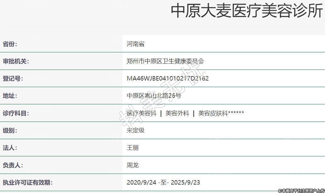 中原大麦医疗美容成立于2019-06-04,地址:中原区嵩山北路26号,诊疗科目:医疗美容科 | 美容外科 | 美容皮肤科******
