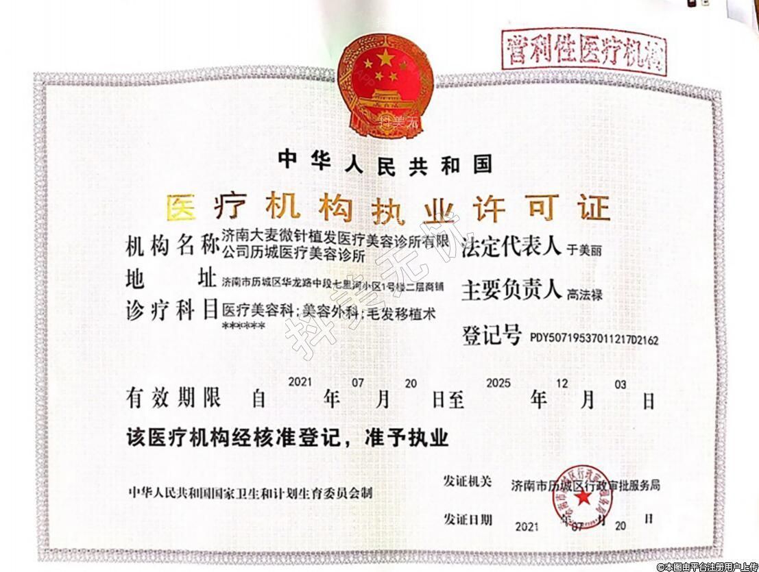 济南大麦微针植发医疗美容成立于2020-07-29,地址:济南市历城区华龙路中段七里河小区1号楼二层商铺,诊疗科目:医疗美容科;美容外科;毛发移植术******