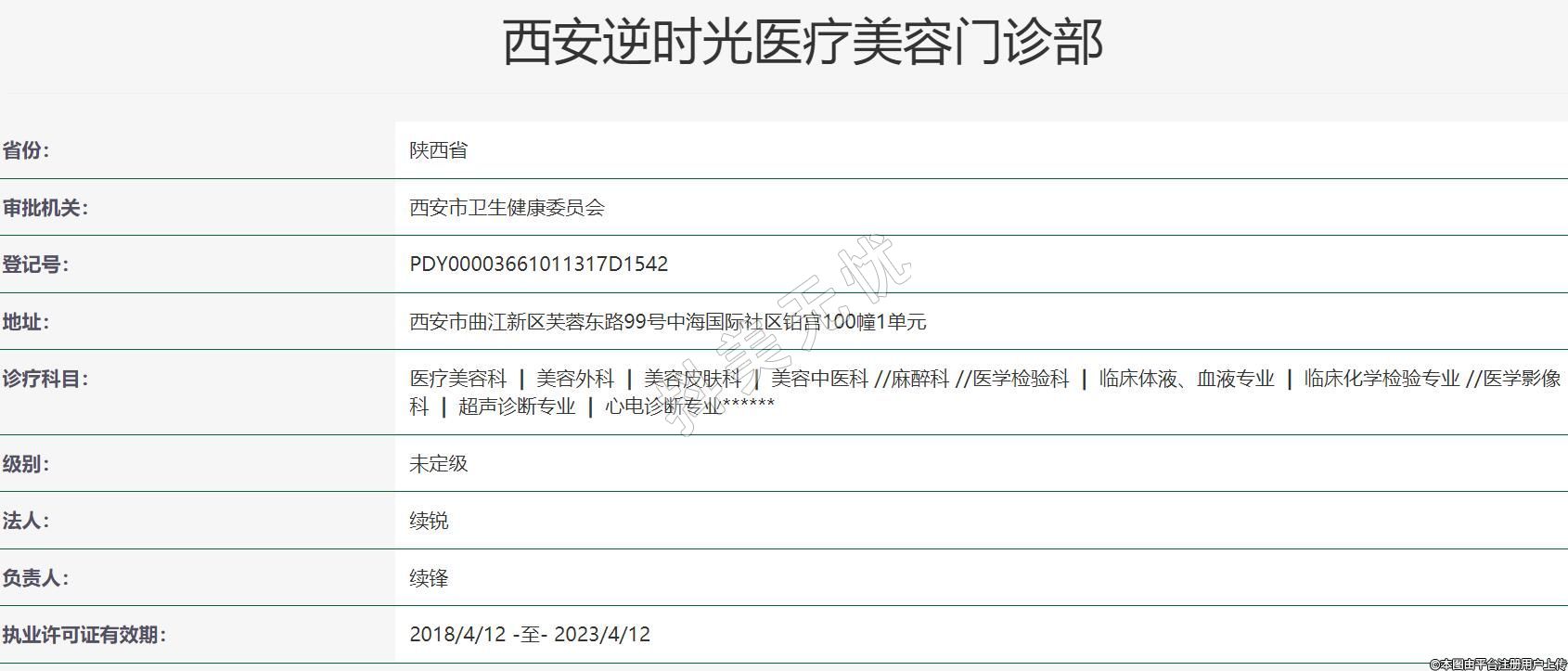 西安逆时光医疗美容地址:西安市曲江新区芙蓉东路99号中海国际社区铂宫100幢1单元,诊疗科目:医疗美容科 | 美容外科 | 美容皮肤科 | 美容中医科 //麻醉科 //医学检验科 | 临床体液、血液专业 | 临床化学检验专业 //医学影像科 | 超声诊断专业 | 心电诊断专业******