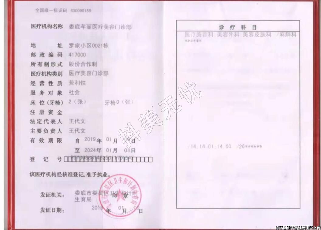 娄底芊丽医疗美容成立于2018-08-02,诊疗科目:医行美容科,美容外科:美容皮肤科/麻醉科******