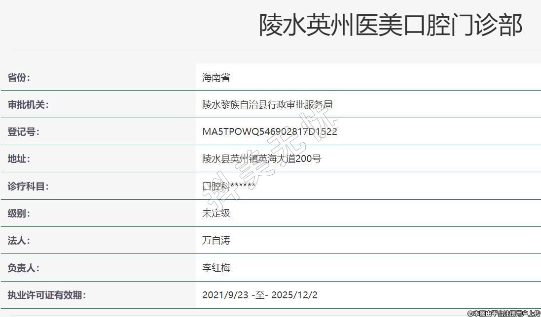 陵水英州医美口腔2020-09-24成立,地址:陵水县英州镇英海大道200号,诊疗科目:口腔科******