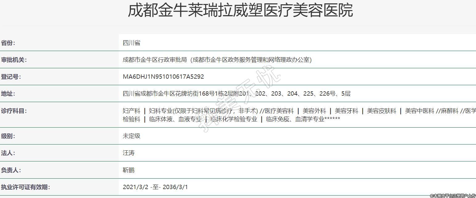 成都莱瑞拉威塑医疗美容2017-09-13成立,诊疗科目:妇产科 | 妇科专业(仅限于妇科常见病诊疗,非手术) //医疗美容科 | 美容外科 | 美容牙科 | 美容皮肤科 | 美容中医科 //麻醉科 //医学检验科 | 临床体液、血液专业 | 临床化学检验专业 | 临床免疫、血清学专业******