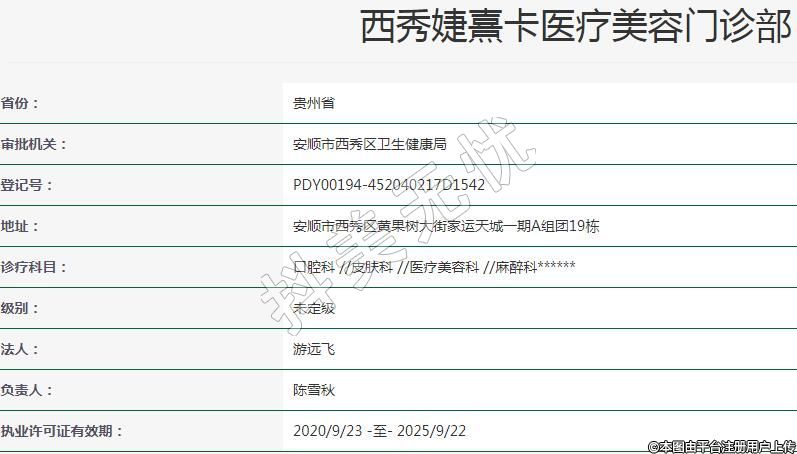 安顺婕熹卡医疗美容2020年04月27日成立,地址:安顺市西秀区黄果树大街家运天城一期A组团19栋,诊疗科目:口腔科 //皮肤科 //医疗美容科 //麻醉科******