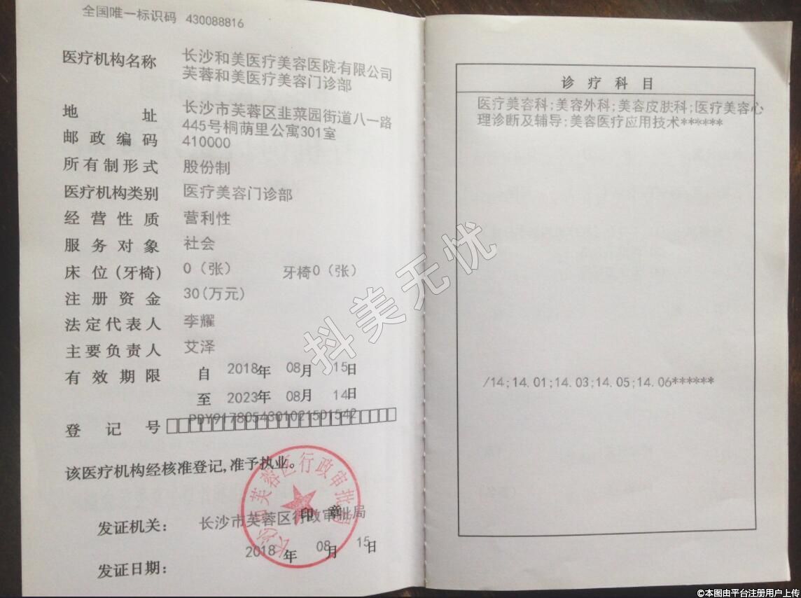 医疗机构名称:长沙和美医疗美容医院有限公司芙蓉和美医疗美容门诊部