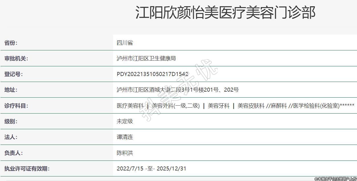 泸州欣颜怡美医疗美容地址:泸州市江阳区酒城大道二段3号1号楼201号、202号,诊疗科目:医疗美容科 | 美容外科(一级,二级) | 美容牙科 | 美容皮肤科 //麻醉科 //医学检验科(化验室)******