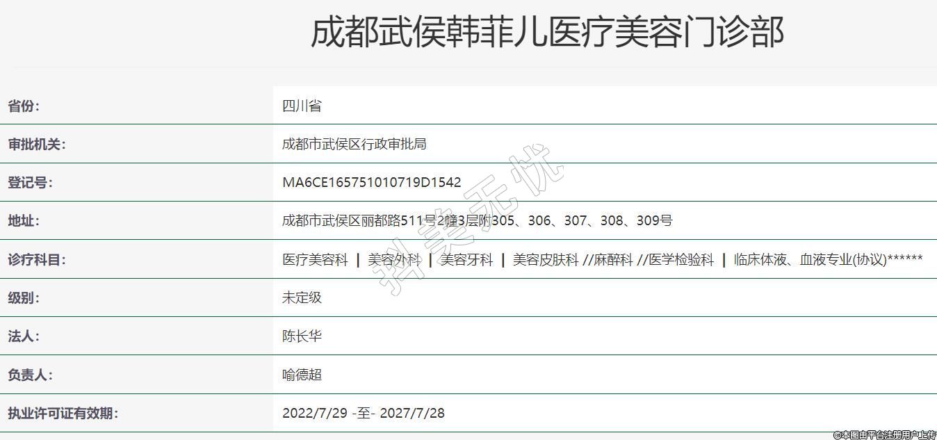 成都武侯韩菲儿医疗美容诊所有限公司成立于2018年4月26日,位于成都市武误区丽都路511号2幢3层附305、306、3017、308号,经营范围:美容外科、美容皮肤科,销售:化妆品、药品、—类医疗器械:第划各类文化交流活动:医疗信息咨询。