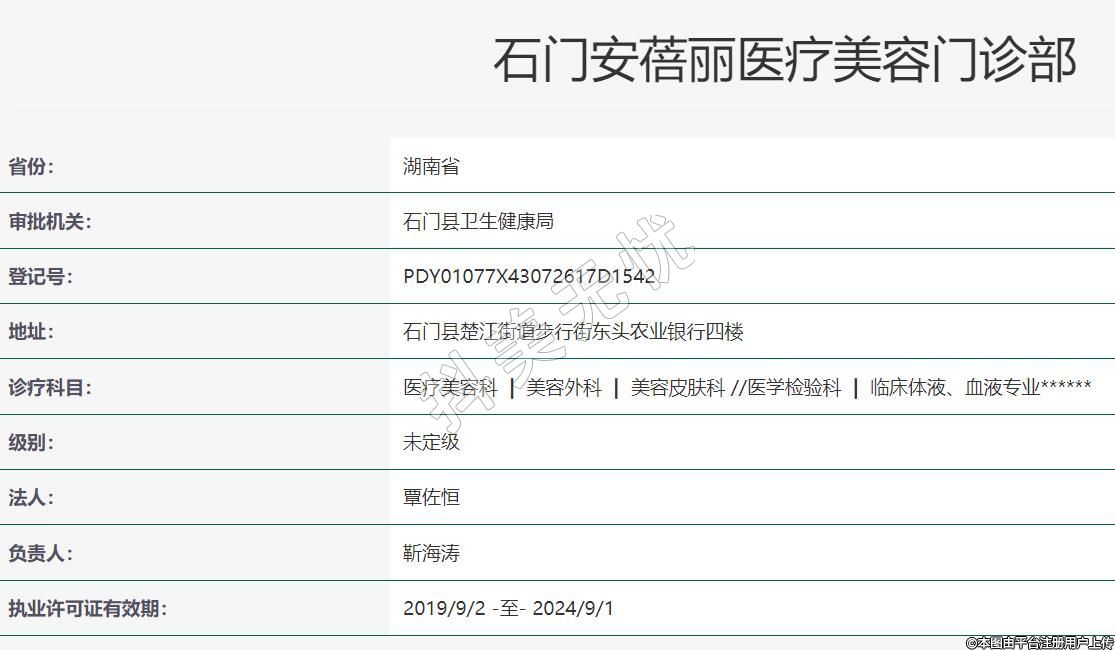 石门安蓓丽医疗美容2018-07-16成立,地址:石门县楚江街道步行街东头农业银行四楼,诊疗科目:医疗美容科 | 美容外科 | 美容皮肤科 //医学检验科 | 临床体液、血液专业******