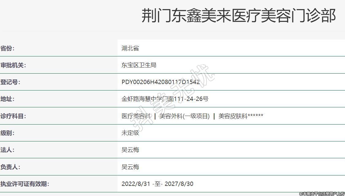 荆门东鑫美来医疗美容2001年12月13日成立,地址:金虾路海慧中学门面111-24-26号,诊疗科目:医疗美容科 | 美容外科(一级项目) | 美容皮肤科******