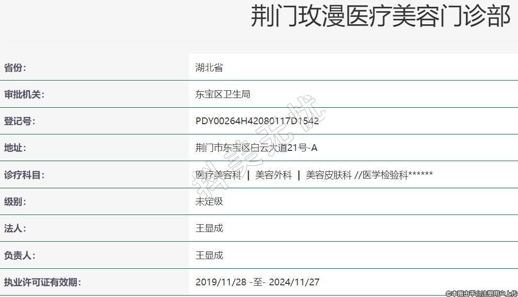 荆门玫漫医疗美容2019-06-10成立,地址:荆门市东宝区白云大道21号-A,诊疗科目:医疗美容科 | 美容外科 | 美容皮肤科 //医学检验科******