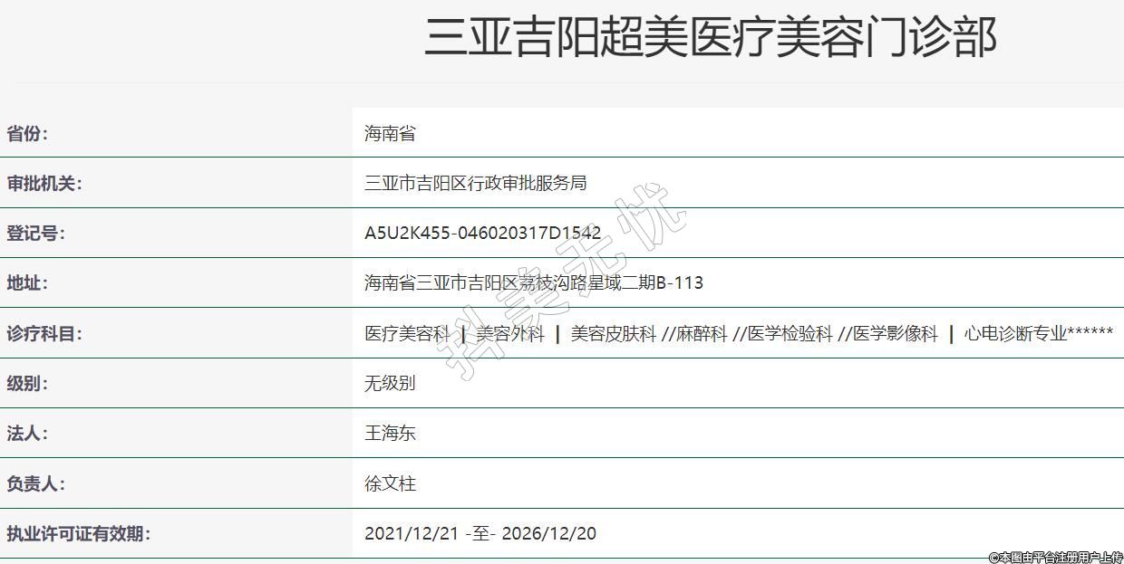 三亚超美医疗美容2022年04月08日成立,地址:海南省三亚市吉阳区荔枝沟路星域二期B-113,诊疗科目:医疗美容科 | 美容外科 | 美容皮肤科 //麻醉科 //医学检验科 //医学影像科 | 心电诊断专业******