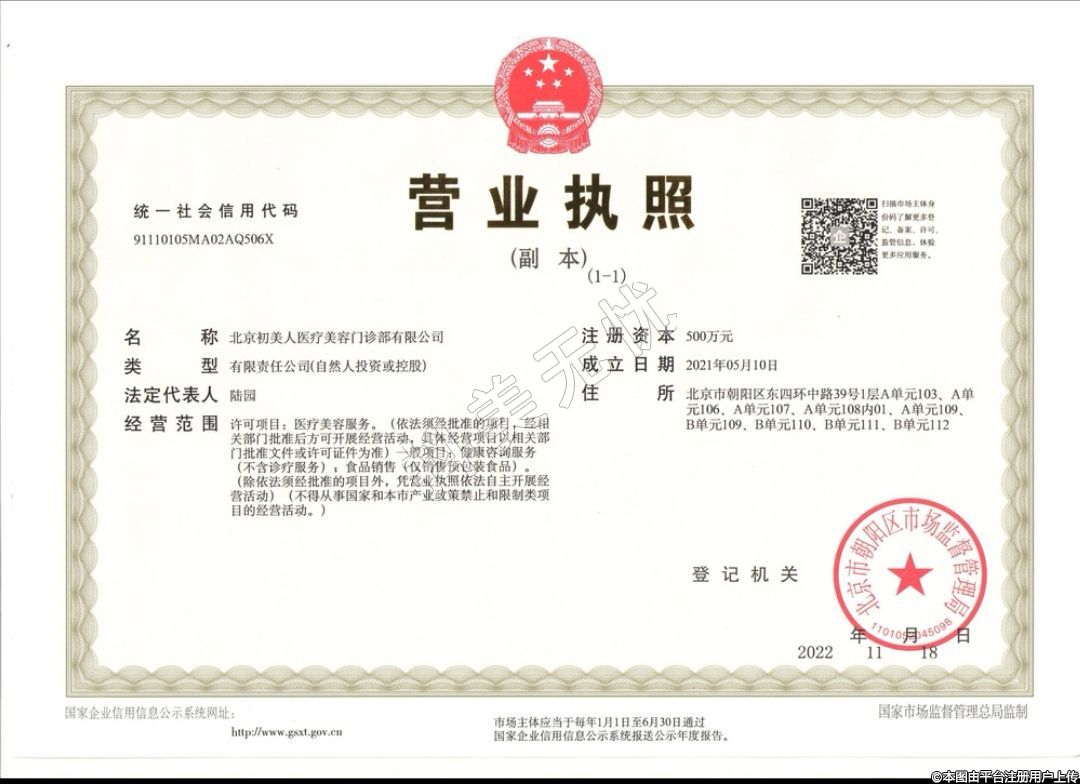 北京初美人医疗美容门诊部有限公司,成立于2021-05-10,诊疗科目:医疗美容科 | 美容外科 | 美容牙科 | 美容皮肤科 //医学检验科 | 临床体液、血液专业 | 临床化学检验专业 | 临床免疫、血清学专业******