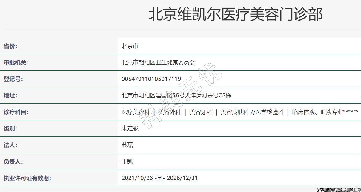 北京维凯尔医疗美容门诊部有限公司成立于2018年2月26日,位于北京市朝阳区建国路56号天洋运河壹号C2栋,诊疗科目:医疗美容科 | 美容外科 | 美容牙科 | 美容皮肤科 //医学检验科 | 临床体液、血液专业******