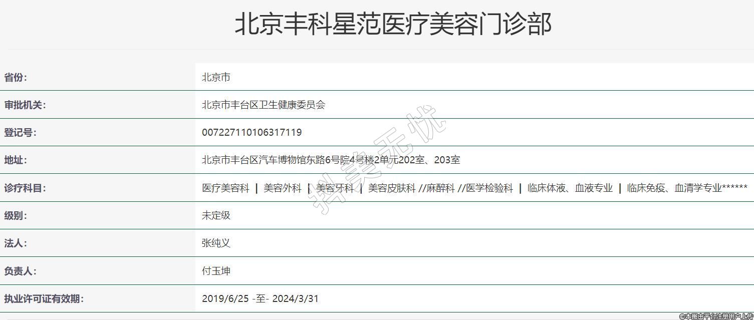 北京丰科星范医疗美容2017-01-16成立,地址:北京市丰台区汽车博物馆东路6号院4号楼2单元202室、203室,诊疗科目:医疗美容科 | 美容外科 | 美容牙科 | 美容皮肤科 //麻醉科 //医学检验科 | 临床体液、血液专业 | 临床免疫、血清学专业******