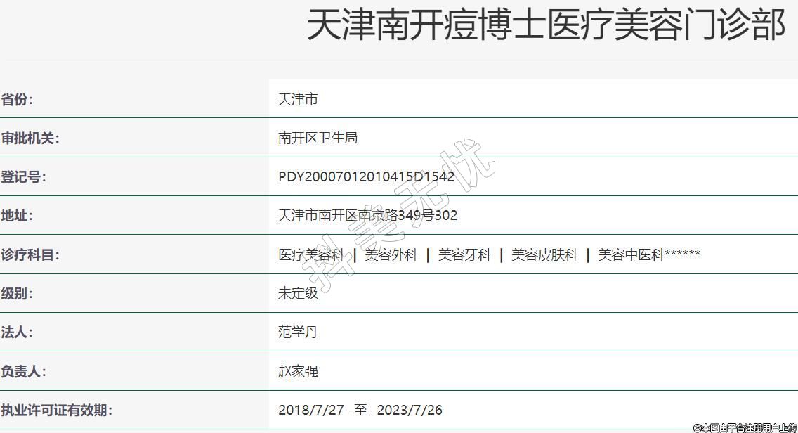 天津痘博士医疗美容2016年01月14日成立,地址:天津市南开区南京路349号302,诊疗科目:医疗美容科 | 美容外科 | 美容牙科 | 美容皮肤科 | 美容中医科******