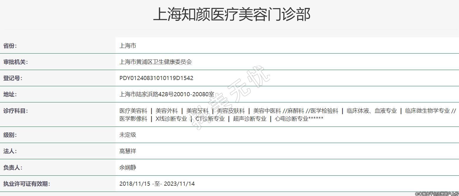 上海知颜医疗美容2018年04月16日成立,地址:上海市陆家浜路428号20010-20080室,诊疗科目:医疗美容科 | 美容外科 | 美容牙科 | 美容皮肤科 | 美容中医科 //麻醉科 //医学检验科 | 临床体液、血液专业 | 临床微生物学专业 //医学影像科 | X线诊断专业 | CT诊断专业 | 超声诊断专业 | 心电诊断专业******