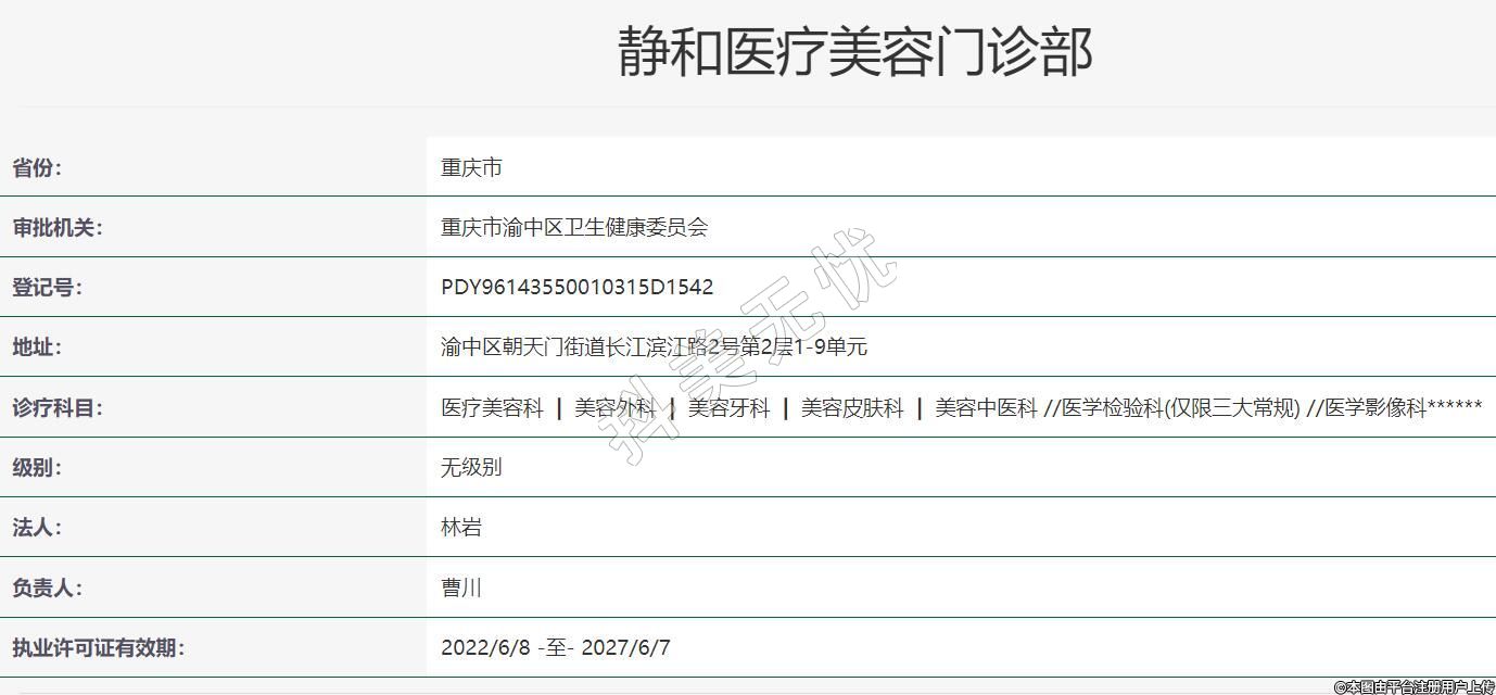重庆静和医疗美容2021年09月22日成立,地址:渝中区朝天门街道长江滨江路2号第2层1-9单元,诊疗科目:医疗美容科 | 美容外科 | 美容牙科 | 美容皮肤科 | 美容中医科 //医学检验科(仅限三大常规) //医学影像科******
