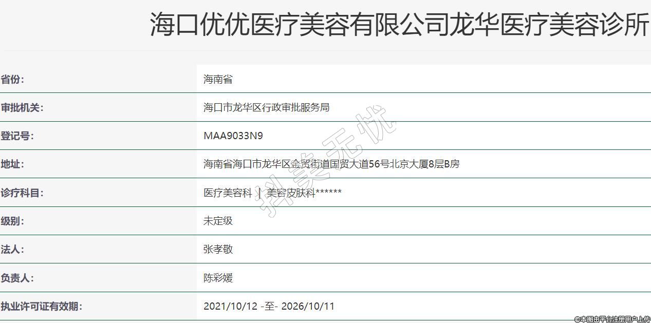 海口优优医疗美容有限公司成立于2021年08月03日,注册地位于海南省海口市龙华区国贸路56号北京大厦8楼B,法定代表人为张孝敬。经营范围包括许可项目:医疗美容服务;生活美容服务(依法须经批准的项目,经相关部门批准后方可开展经营活动)