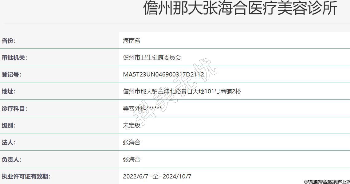 儋州那大张海合医疗美容诊所,成立于2022-06-01,法定代表人为张海合,注册地位于海南省儋州市那大镇兰洋北路夏日天地101号商铺二楼,经营范围包括许可项目:医疗美容服务;生活美容服务(依法须经批准的项目,经相关部门批准后方可开展经营活动)