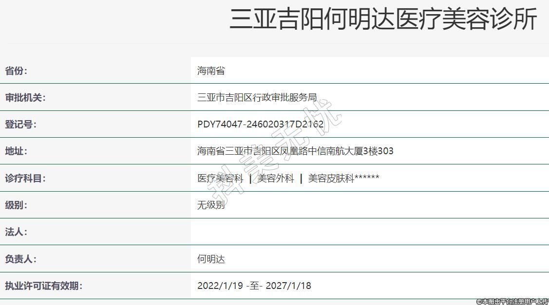 三亚何明达医疗美容2022-03-16成立,地址:海南省三亚市吉阳区凤凰路中信南航大厦3楼303,诊疗科目:医疗美容科 | 美容外科 | 美容皮肤科******