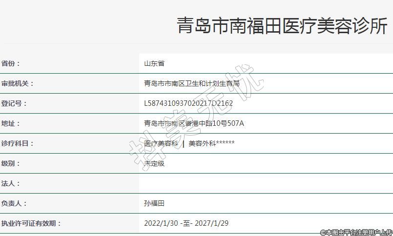 青岛福田医疗美容2007-03-13成立,地址:青岛市市南区香港中路10号507A,诊疗科目:医疗美容科 | 美容外科******