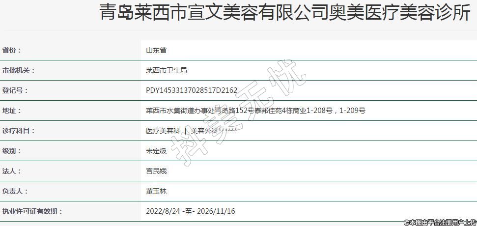 青岛奥美医疗美容2021年07月27日成立,地址:莱西市水集街道办事处青岛路152号泰邦佳苑4栋商业1-208号,1-209号,诊疗科目:医疗美容科 | 美容外科******