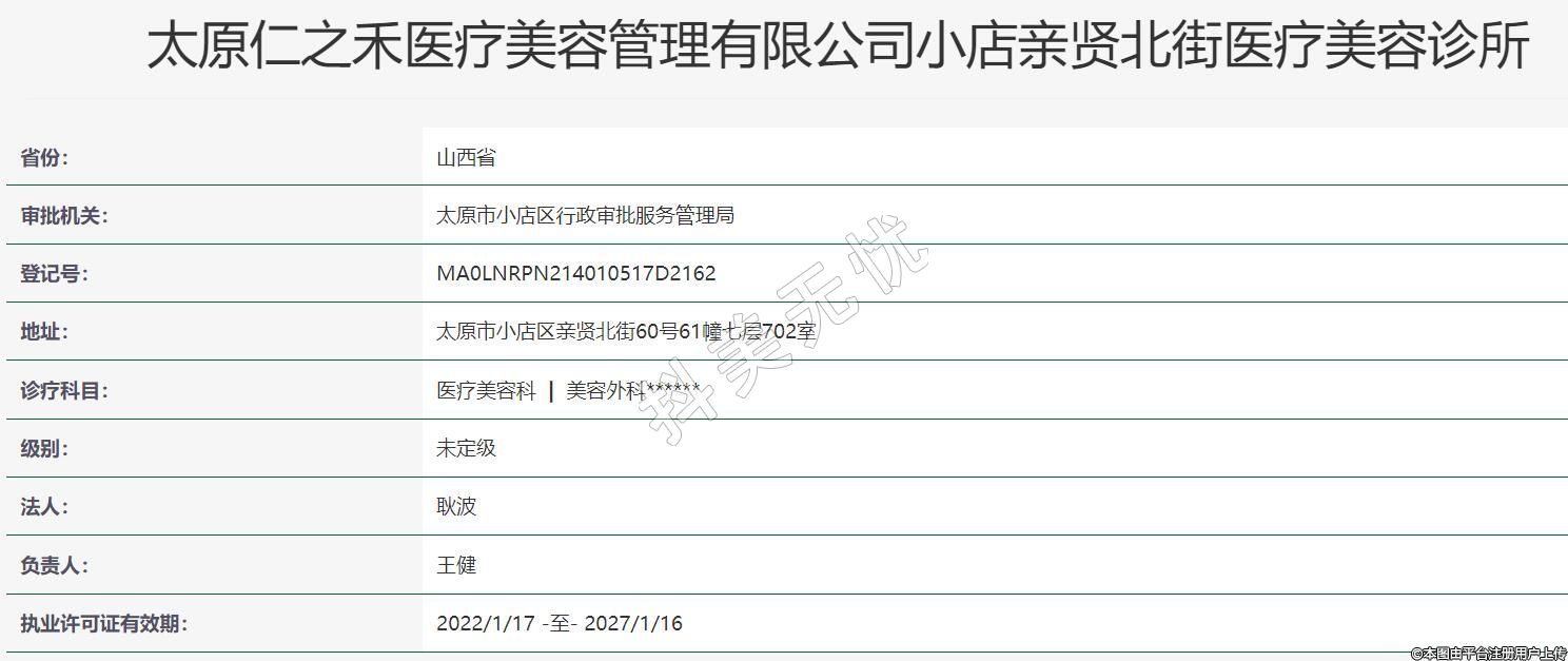 太原仁之禾医疗美容2021年12月14日成立,地址:太原市小店区亲贤北街60号61幢七层702室,诊疗科目:医疗美容科 | 美容外科******