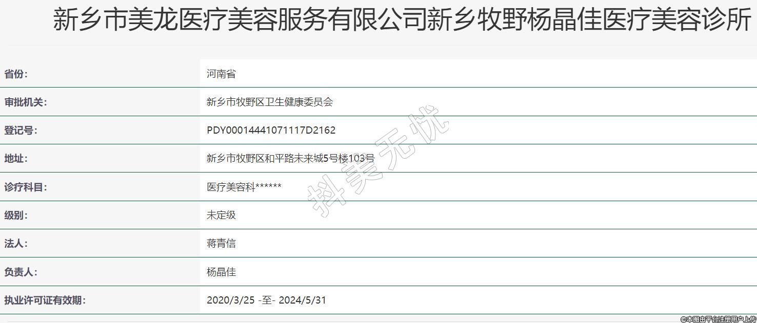 新乡市美龙医疗美容服务有限公司新乡牧野杨晶佳医疗美容诊所地址:新乡市牧野区和平路未来城5号楼103号,诊疗科目:医疗美容科******
