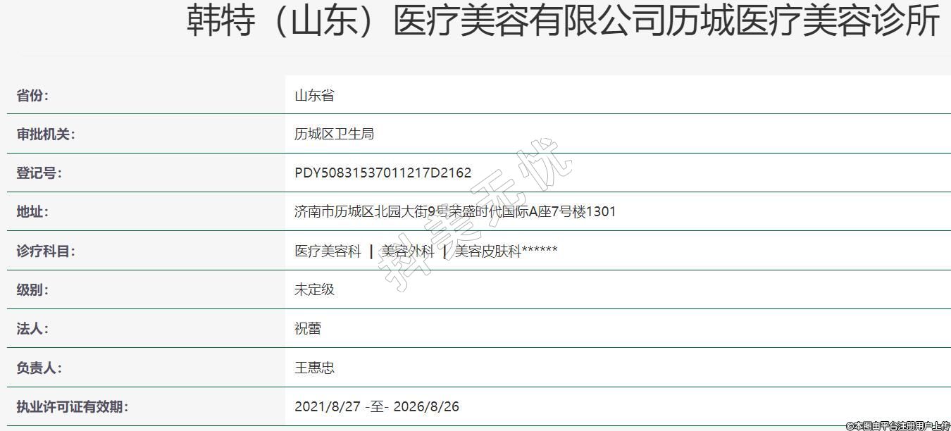 韩特(山东)医疗美容有限公司历城医疗美容诊所成立时间2020-08-11,位于济南市历城区北园大街9号荣盛时代A座7号楼1301
