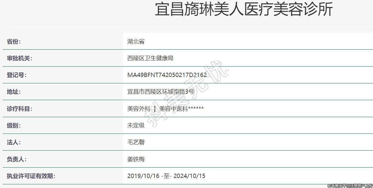 宜昌旖琳美人医疗美容2019年10月09日成立,地址:宜昌市西陵区环城南路3号,诊疗科目:美容外科 | 美容中医科******